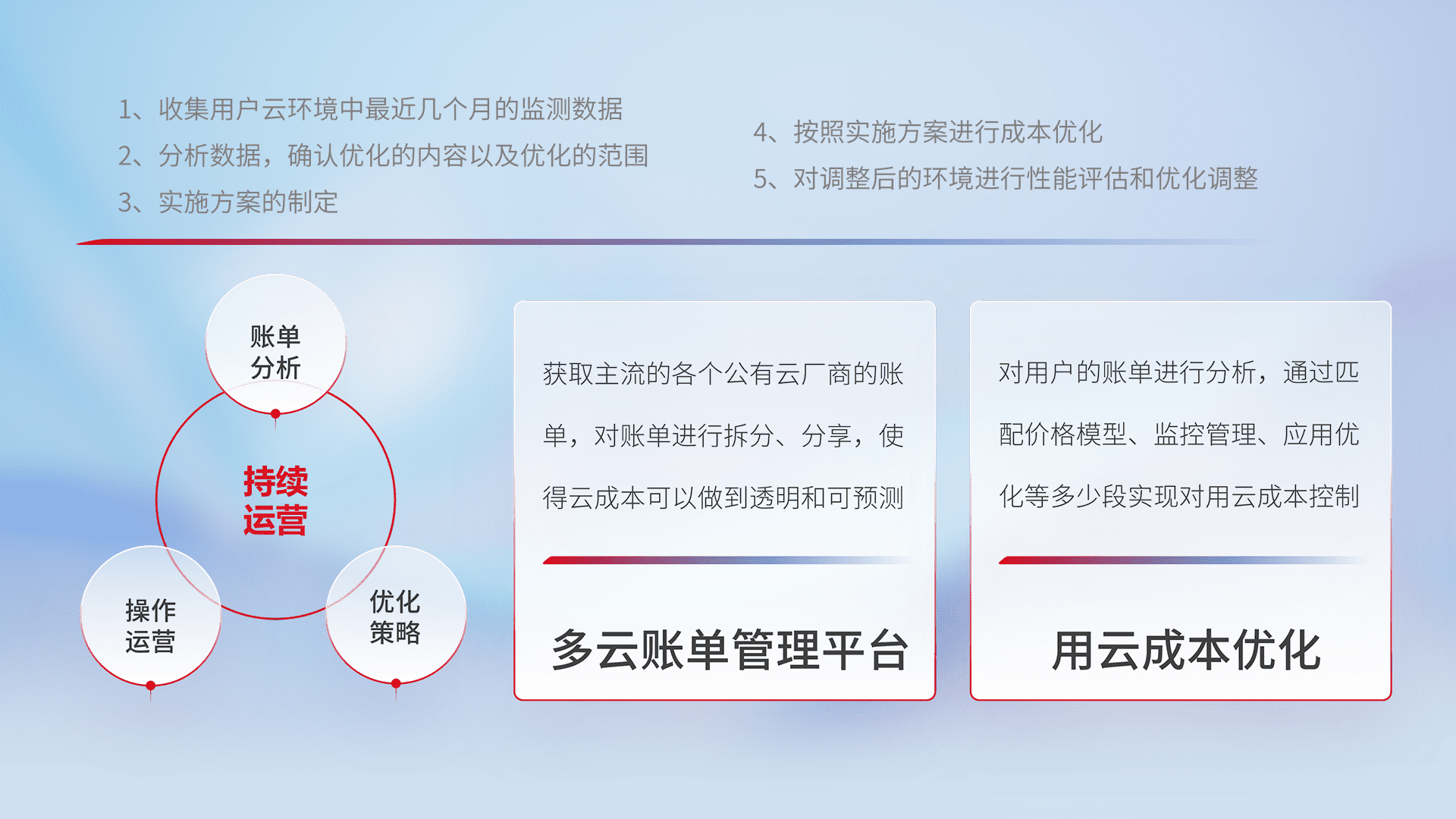 通过多云纳管,,,以统一的资源数据模型把客户的云资源进行抽象和封装,,,进而实现对多云资源的统一操作,,,保障云资源管理的可靠性、、、稳定性与可用性。。。。量身定制化运维内容,,,配置、、、开发运维、、补丁管理、、、备份、、、、监控、、、、认证和访问管理、、审计和日常巡检等,,,,保障在用云过程中的可靠度,,,,稳定度以及高可用率。。。