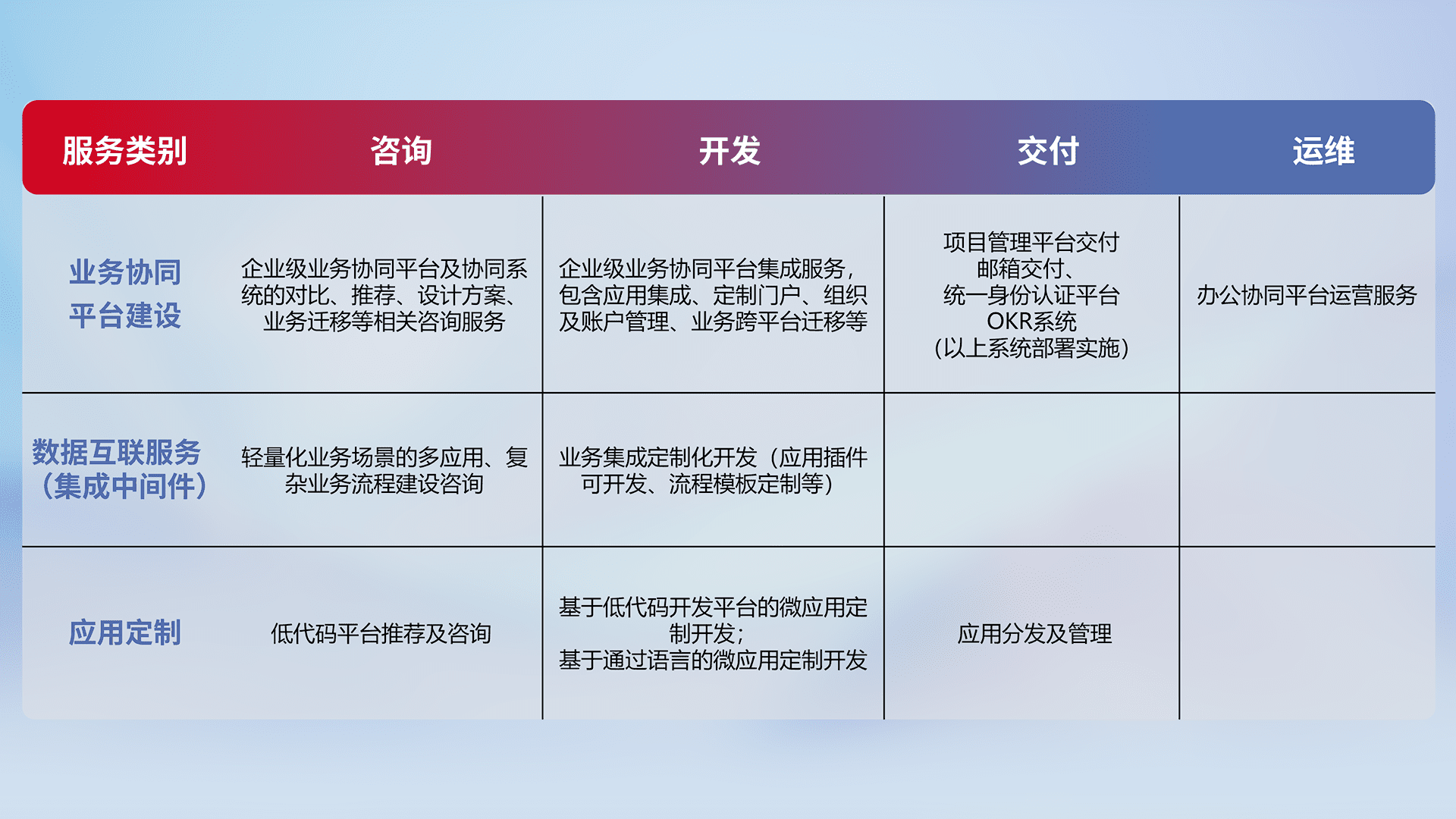 针对钉钉、、、、企微、、IDaas等平台级产品提供产品的规划、、、、方案、、、、交付、、定制化开发等服务,,实现如统一协同办公、、智能客户服务、、、混合会议管理、、、智能数据查询、、等业务场景,,,实现数字化转型。。